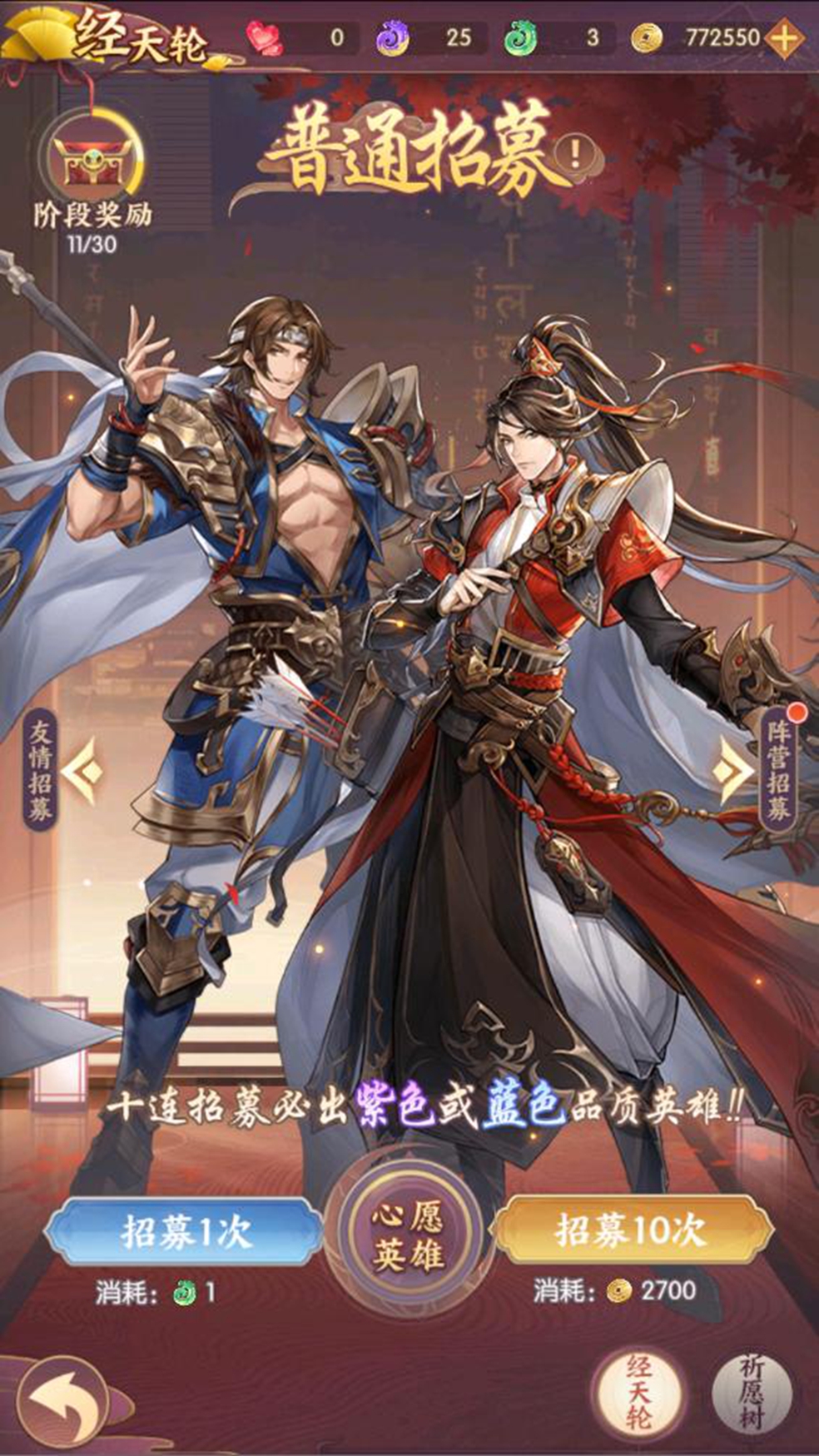 开启后,玩家可于经天轮中招募英雄,经天轮中包含:标准池、阵营池、友情池,通关12-1开放祈愿树功能。