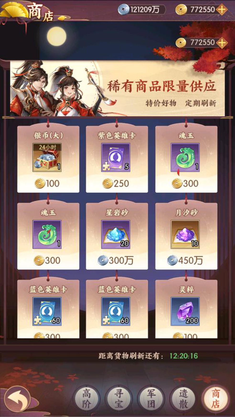商店分为普通商店、遣散商店、军团商店、寻宝商店、竞技商店玩家可消耗相应资源兑换英雄、英雄碎片、装备、银币等资源。