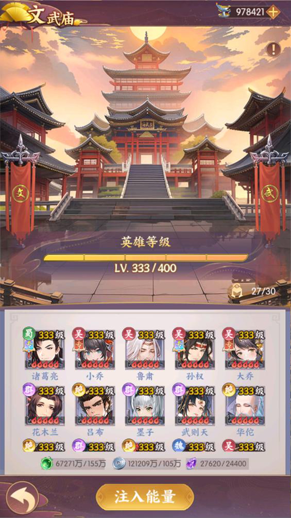 文武庙玩法为等级共享玩法,等级最高的五名英雄会自动成为文武庙领袖,玩家需要消耗贡灯解锁文武庙上阵位,文武庙中上阵的英雄等级与文武庙领袖最低等级相关。