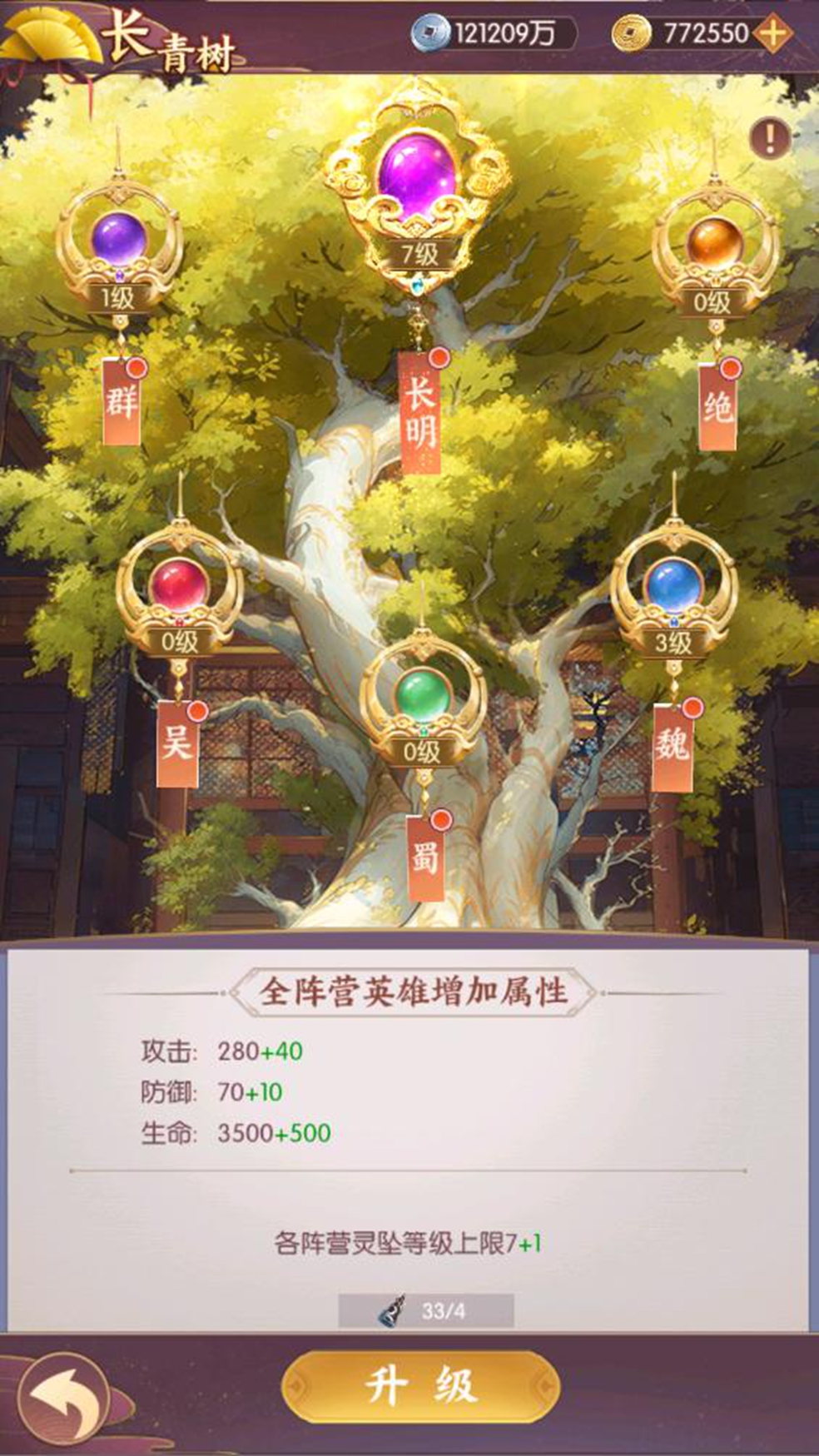 长青树玩法为阵营养成玩法的一个部分,升级长明坠等级可提升各阵营等级上限,提升对应阵营等级可提升阵营英雄属性,各阵营达到对应等级还可解锁暴击伤害、伤害减免、伤害加成等特殊属性