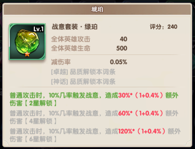 可增加全体英雄攻击、生命、伤害加成、减伤率、免控率并根据星级附加套装效果。