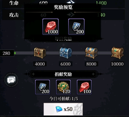 2、【联盟捐献】每天可以免费捐献1次,也可以消耗钻石捐献。捐献奖励中有钻石、升级材料和联盟币。联盟币可以在联盟商店兑换圣器和角色本体碎片,需要注意的是兑换是每月限购的。