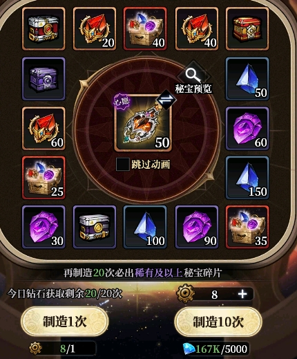 9、【秘宝实验室】在这里是每天可以花费钻石抽20次奖,是获取秘宝碎片和秘宝升级材料的好地方。