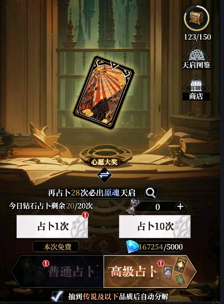 10、【圣山秘境】里面的塔罗占卜,每天20次钻石抽奖机会,这是获得原魂天启最快的地方,建议天启可以先攒一套,比如诸神黄昏套,优先给主C用。