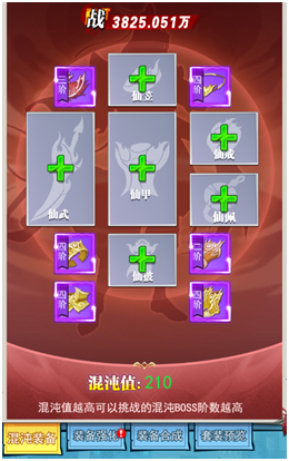 混沌装备分为仙魂、魔魂两种,每种各六个部位;魔魂装备可通过击杀混沌BOSS获得,仙魂装备击杀混沌BOSS有较低概率获得;每个部位都会提供混沌值,混沌值越高可挑战的混沌BOSS等级越高;分解多余的混沌装备还可获得混沌装备强化材料,强化后提供角色属性加成。