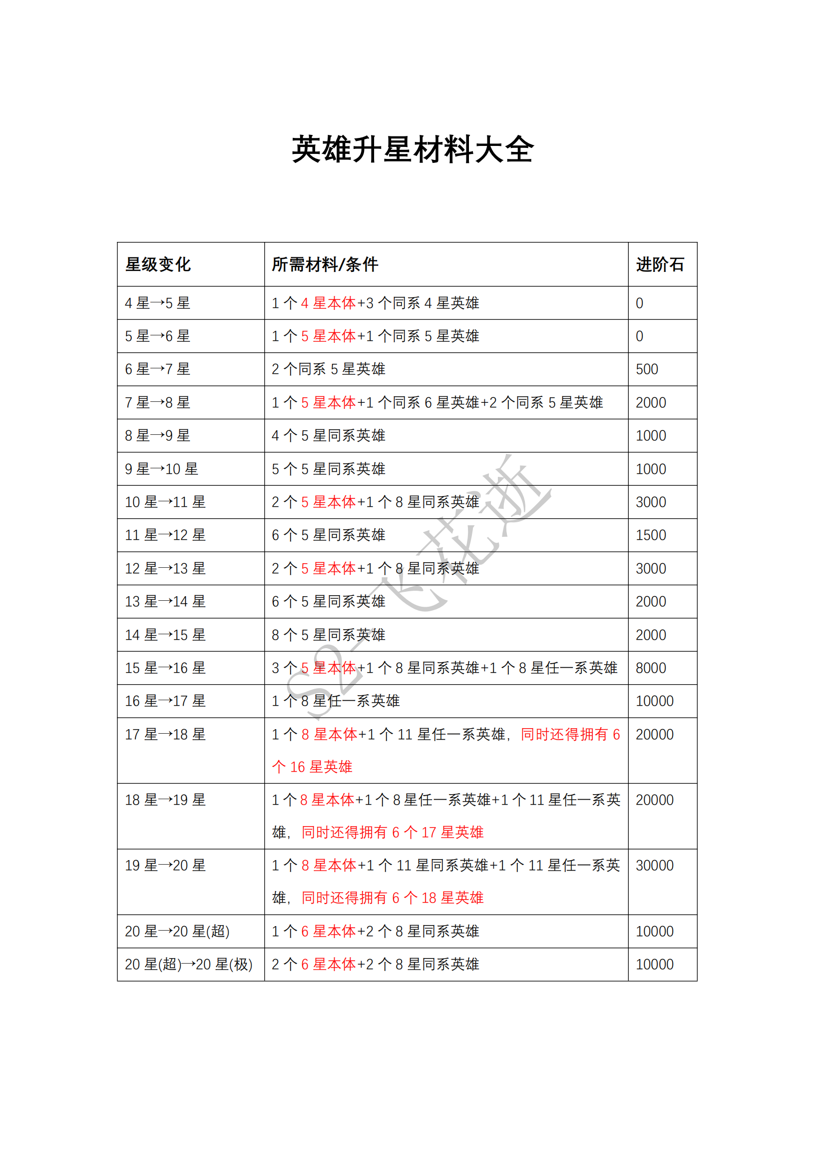 注:光暗英雄升星中所需的同系英雄材料为风、水、火、土中其中一种,数量皆与上相同