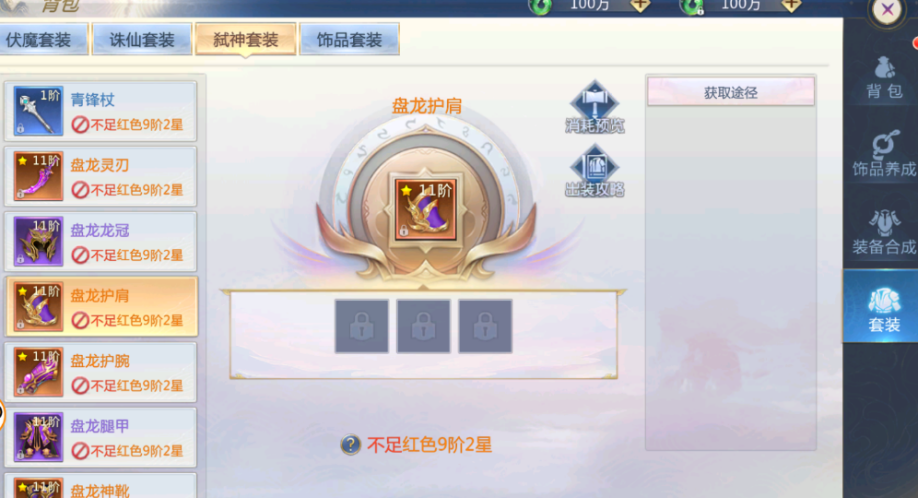 4.不同阶数的套装可兼容低阶套装的套装属性(诛仙弑神绝魔同理)同一件套的套装属性只能同时存在一个(取套装等级较高者)替换装备时,将自动拆解或转移套装石。