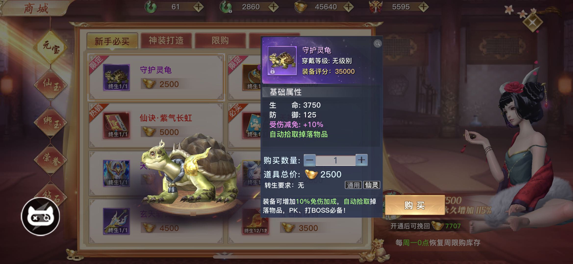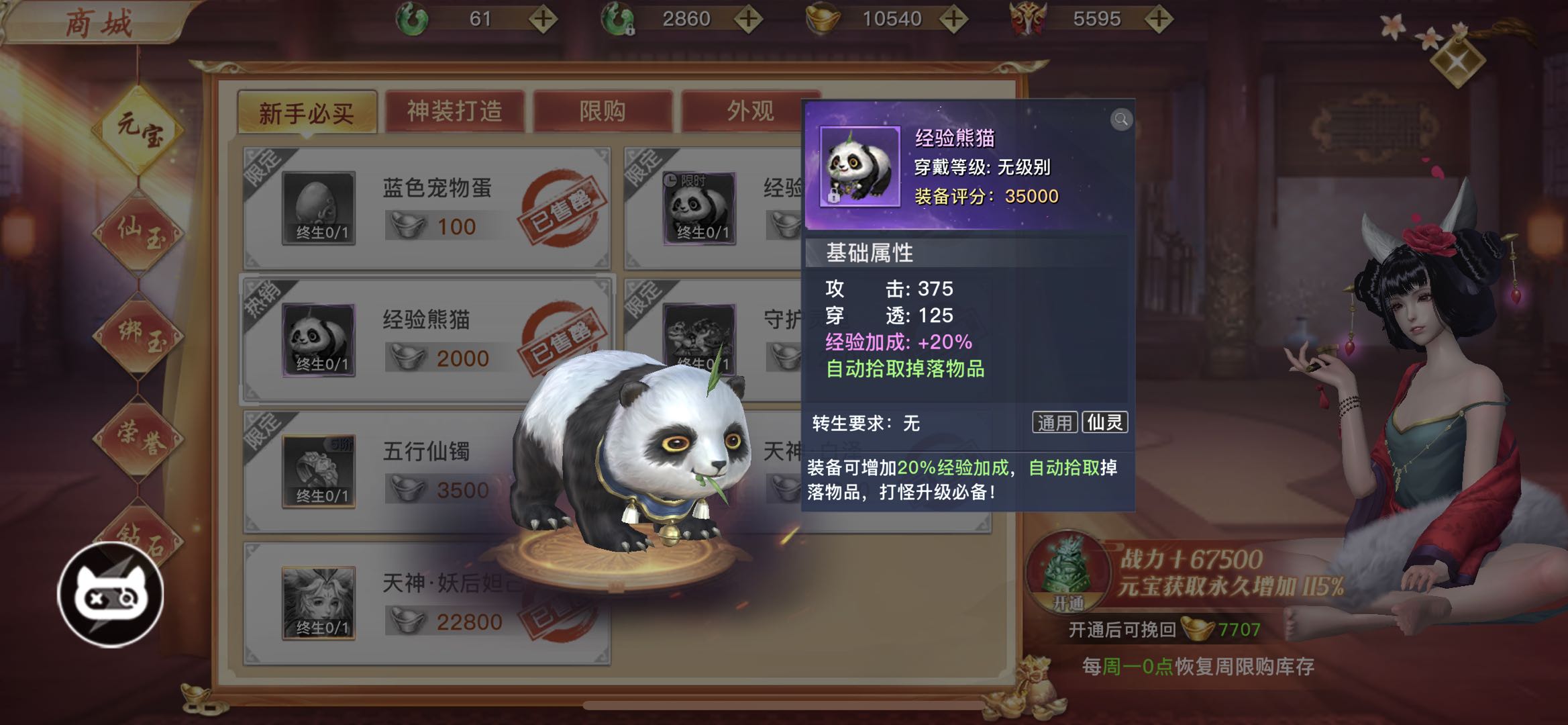 除了普通装备外,商城永久限购熊猫和灵龟是必买的,分别可以增加经验和减伤这两个守护的属性,是新人修仙前期需求的核心道具。通过商城还可以购买进阶道具为熊猫和灵龟升阶,提升属性百分比。