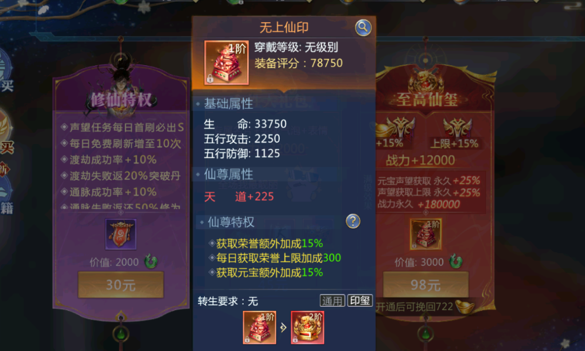 七、印玺装备除了普通装备之外,还有额外的印玺装备,有豪华仙尊特权,获取荣誉额外加成15%,每日获取荣誉上限加成300,获取元宝额外加成15%
