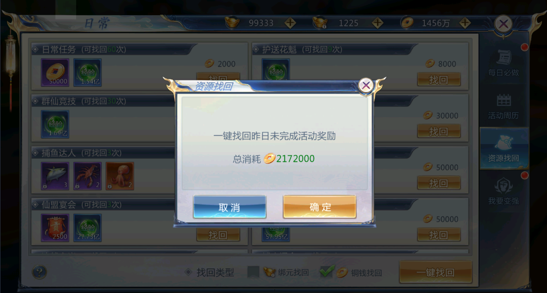 ★铜钱找回只能找回绑玉找回的80%奖励