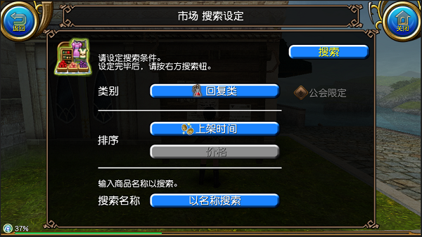 从类别栏选择类似『回复类』『单手剑』这种,从图标上选择想要的道具的类别,排序可选择按照『上架时间』『价格』,选择海后,点击忧伤的『搜索』按钮即可开始搜索市场。