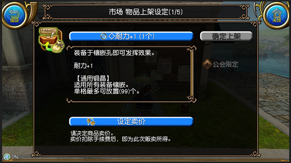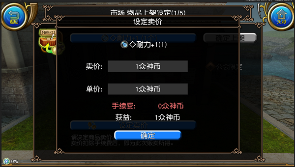 决定价格后,点击“确定上架”按钮即可将物品上架至市场。