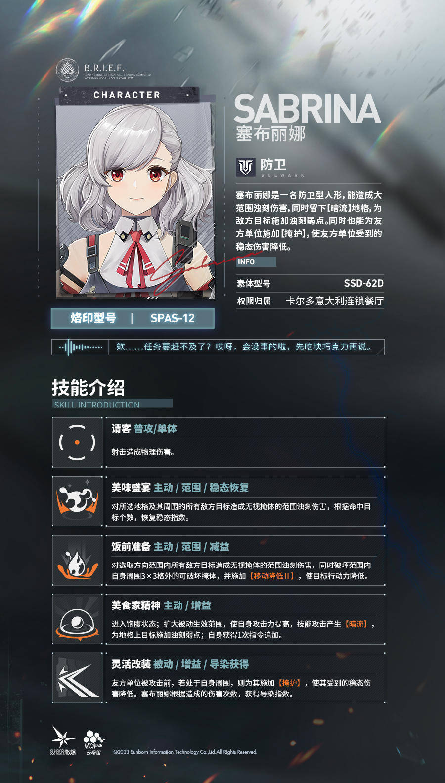 技能等级高的萨布丽娜甚至可以选择切换固定关键位置来触发具有嘲讽、吸引等效果的技能,十分强大。可惜的是她前期无法解锁固定钥匙,而且防御面板在低等级时也相对不足。她需要在中后期解锁武器配件和固定关键功能,才能充分发挥自己的战斗力。