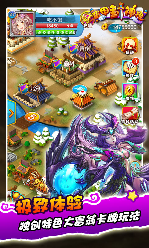 庙宇:能用20元宝抽奖抽卡牌、金币、法宝。可以抽出四星五星英雄,大小财神,财神珠、法宝。
