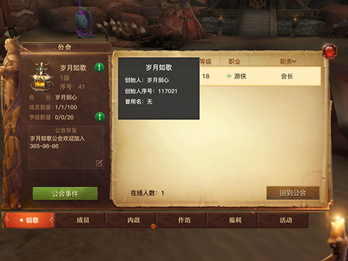 公会首页会显示创始人,公会公告,成员人数,学徒人数,在线情况等信息