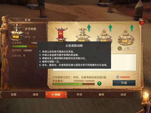 ④仓库——升级增加公会任务获得的分红奖励,增加公会资金上限