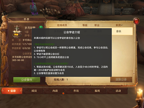 学徒系统,直接申请加入公会,默认批准为学徒,会长可以自行设定,入会时间及贡献达到要求即可转正,公会会长也可以提前将学徒任命为会员