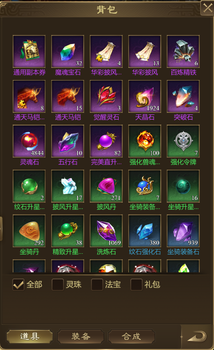点击主界面下方“包裹”图标,打开“背包”界面,点击道具栏中的某个物品,即可查看和使用道具;在“装备”页面点击“分解”可进行所有符合条件物品的分解;部分道具可在“合成”页面进行合成;