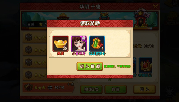 挑战剧情副本中可获得评分星数,评分星数积累到一定程度可开启宝箱奖励关,成功收集箱子后,可开启星级宝箱,星级宝箱中有大量资源,包括武将碎片,大量元宝,招募令等,多多收集武将碎片和装备碎片,这是前期提升战力必要的!