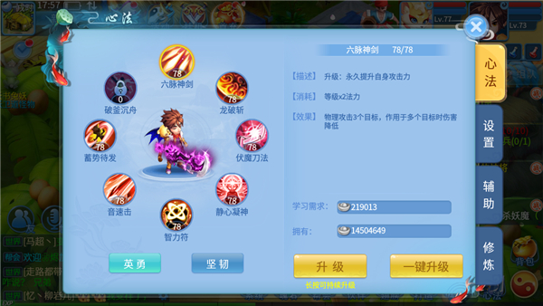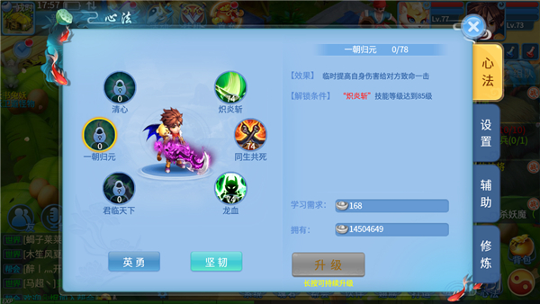 技能名字非常霸气,效果是连续攻击目标两次,但伤害会降低10%。虽然爆发力比不上其余心法,但胜在这技能没有副作用,不会影响下一回合的行动,也就是说可以每回合都使用。如果是长期战的话,这心法的持续输出能力其实也不弱。