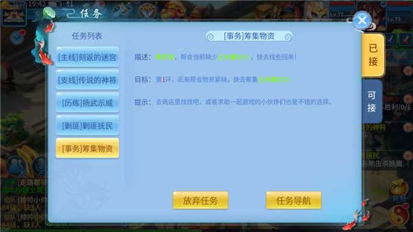 点击任务栏上方的“任务”二字,即可进入任务界面,可以看到已接和可接任务,也可以对某个任务进行放弃。有时我们在帮会事务时,需要我们找一个透骨钉,这时如果市场上买卖的话,可以通过放弃任务的方法重新领取任务,就能比较轻松地完成。这一原理也适用于木牛流马,如果当次木牛流马没有装过东西,可以直接放弃,过1个小时就能领新的了。