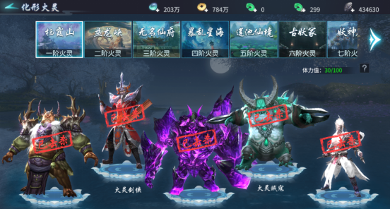 进入【斩仙】-【化形火灵】,可以进行游戏挑战,通关后副本会掉落对应装备,还有各颜色的图鉴等物资掉落。其中包含11阶不同的火灵副本,每个副本掉落的是从“筑基”到“仙变”9个转生阶段对应的装备。如【栖霞山】掉落的是“筑基”的紫色装备,【盘龙峡】掉落的是“金丹”的紫色装备。