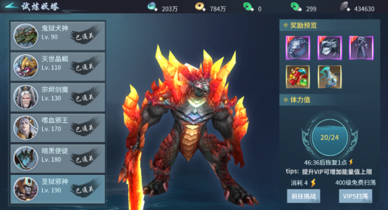 进入【斩仙】-【试炼妖塔】,可以挑战各个等级的Boss,通关后副本会掉落对应装备,还有离线经验药和进阶材料礼包等物资掉落。其中包含了多个Boss供挑战,每个Boss掉落的是从“炼气”到“仙变”10个转生阶段对应的装备。每转生一次就后开启后续等级的Boss。
