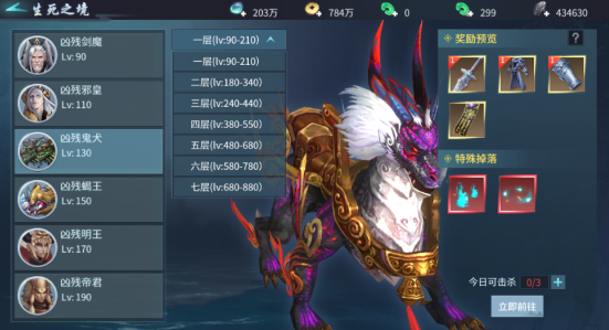进入【斩仙】-【生死之境】,每天可以击杀3只Boss,击杀3只后当天无法再对生死之境Boss造成伤害,使用斩仙令牌可以增加挑战次数。击杀Boss后会掉落对应装备,还有机会获得时装形象等特殊掉落。【生死之境】总共有七层,每层的Boss等级不同,掉落的也是从“筑基”到“仙变”9个转生阶段对应的装备。