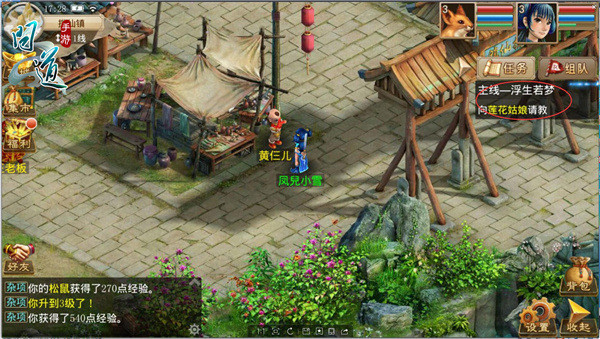 被妖魔追赶的你受伤昏倒在揽仙镇外,机缘巧合之下被多闻道人所救,此时你将接受【浮生若梦】(主线)任务,这是你第一个任务,该任务除了能给你大量的经验、金钱奖励之外,还将会给你行走江湖必备药品、装备、忠心耿耿的宠物,这个阶段新手主线任务是最快的升级途径,很快就达到了15级,此时的你对江湖也有一定的了解,同时也拜入师门,开启了师尊指派的师门任务,师门任务奖励经验、金钱奖励之外,还给了大量的潜能奖励,消耗潜能直接提高你的技能熟练度,真是如虎添翼。