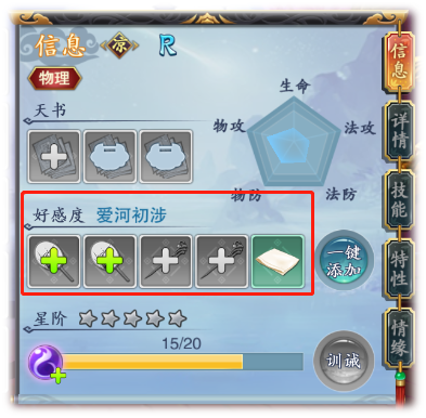 好感度收集完成可一件穿戴,全部缠带满后,则可以直接对目前好感度做升级,升级后,武将高阶技能会依次开启;