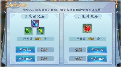 升星石有效提高武器三维属性的一个比较快速的突进,玩家可以通过我的地盘——郊外矿场(开启等级),每日开采完免费次数或购买额外开采次数,来获得更多的升星石和强化石,