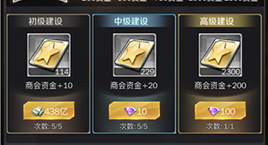 【商会建设】商会建设是我们获得贡献最稳定的手段,商会建设分为初级、中级和高级,初级需要消耗美金,中级和高级需要消耗钻石,想要高效率获得商会贡献,这几种商会建设一定不能错过。