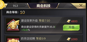 同时为了配合商会建设获得更多贡献,我们需要及时升级商会科技里面的“建设效率”技能等级。