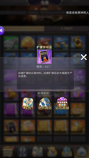 店铺升级所需的扩建许可证,大部分来源都是通过跑主线,但是主线并不是随心所欲想跑就跑的,中后期由于卡名望卡身份根本就很少有机会跑主线,扩建卡一定要慎重使用。店铺的升级推荐最多主升到1个14级店铺,2个13级,3个12级,4个11级,后期对几个低级店铺慢慢的提升即可,千万不要升级15级店铺,收益加成不高并且非常浪费扩建卡。店铺的派遣人才建议以橙人为主并且根据经营能力和技能的高低依次排序逐级派遣,紫色人才的推荐店铺并不一定很合适,具体根据经营能力和技能正确搭配即可。