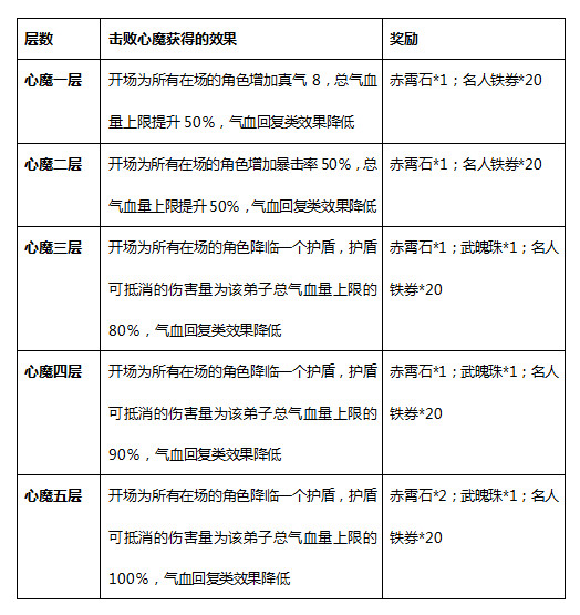 如前文中提到的,其实《大掌门2》江湖名人榜里的挑战心魔就是和自己对抗,确切的说是和前一天最高战力的自己打。心魔分为5层,前1-2层心魔的战斗力还是比较容易被掌门攻克,也并没有特别的属性加成。进入第3层和第4层,心魔的战斗力已经增强了许多,若掌门依旧用前一日的布阵方式和战斗力去对抗,那么就要小心在第3层受挫了!