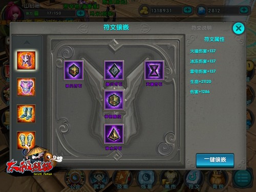 符文系统:符文主要由关卡掉落、夺宝系统和祭坛抽取获得的,高质量的符文石能与装备产生互相呼应,互为提升战斗力,这点会被比较多的玩家忽略。不断提升符文石能增强玩家的战斗力。