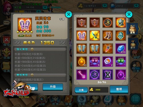提升装备:在《太极熊猫》的游戏里面,玩家更替、强化以及精炼装备,都会提升战力。目前玩家获得装备的方法有:祭坛抽取、碎片合成、关卡掉落、黑市兑换等几种方式。