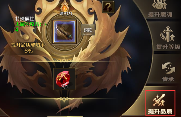 每次提升品质需要消耗1颗灵魂晶石,而想要成功提升武器的品质还需要一定的运气。灵魂晶石可通过完成挑战副本、击败世界boss等方式获得,当然,直接从玩家手中收购,或者去魔石商店购买是更加便捷的方式。