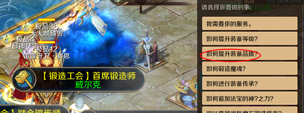 点击右上角地图 然后选择市场区点开就可以看到锻造了,锻造工会首席锻造师威尔克处可进行提升品质。提升品质是武器强化的几种方式之一,需要消耗灵魂晶石。