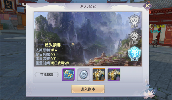 江湖异常险恶,各位少侠需要勤习武艺,方能自保。这个时候绝对不能错过单人试炼,等级达到54级可前往挑战。每日可随机接受三次试炼任务,完成后不仅可以获得大量的经验,还有几率获得橙色装备。
