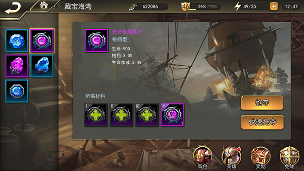 玩家可以通过完成任务、觉醒宝箱、系统活动等玩法获得魔石碎片,之后可以通过藏宝港湾将所需的其余碎片收集完成,合成完整形态的魔石。大家切记,获得稀有碎片一定要第一时间将其合成完整魔石,不然很容易在藏宝海湾被人抢走哦!