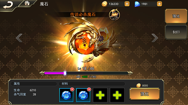 玩家等级到达27级之后会开启魔石刻印,魔石刻印通过消耗刻印石头增加属性。在刻印界面,魔石周围会出现多个圆形图标,每次刻印都会点亮其中的圆点,全部点亮后可进行魔石突破,突破会额外消耗魔石,所以同样的魔石要记得多存几个以备突破使用,千万不要将多余的橙色魔石用作强化材料哦。