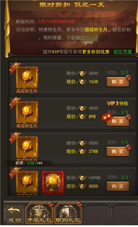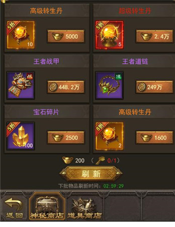 能快速提升自己的战力,就是转生了,在开服第一天最好把自己转生到4级,转生丹可在商城里的神秘商店进行购买,这时候要记住,千万别在转生界面直接点,你可以不断刷新,选五折的转生丹,刷一次不行就两次,总之,多刷几次总能出来的。