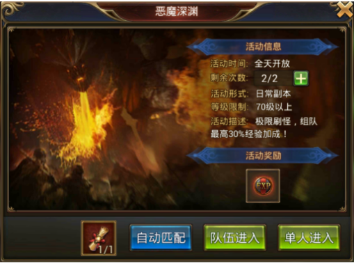 4、赏金任务每天必须完成,有大量的金币和经验;恶魔深渊更加是少不了(最好是在当天经验获得的任务都完成再打),它是经验获得最高的来源,建议组队一起打,有组队经验加成,同时最好能够进行鼓舞(如果是非R可以用金币鼓舞到50%,如果是土豪那么可以鼓舞到100%),经验丹也要吃(最好是2倍,没有的用1.5倍也行),打完恶魔深渊一般还要等3分钟左右才能再打下一次,这个时候可以去做一下单人副本或者直接挂机打怪,在经验丹的持续时间内把恶魔深渊都通关完。(当然啦,有钱的土豪可以提升vip等级增加购买次数)