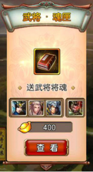 3. 武将.魂匣:达到 VIP8 后开启,单次抽取花费 400 黄金,每次可获得 10 样物品,有机率获得只有魂匣才拥有的专属武将。