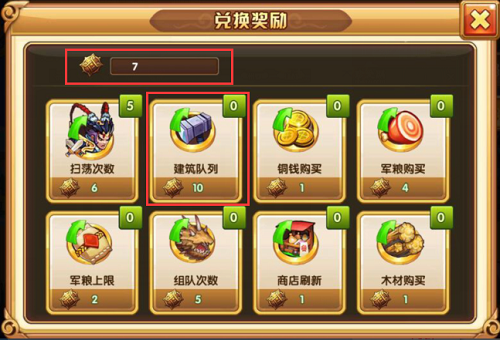 下面就是兑换奖励界面,左上方是主公的历练点数,下面是奖励,小云建议主公先兑换建筑队列,为什么要兑换建筑队列,下面小云会说的,别着急嘛ლ(╹◡╹ლ)