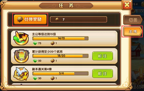 首先我们先进入任务界面,点击右侧的主线任务,在主公完成主线任务时会获得历练点,点击左上角的兑换奖励,便可进行兑换。