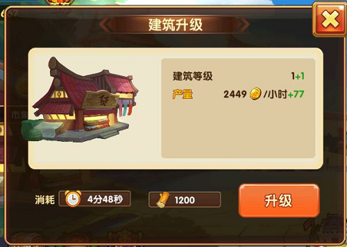 建筑的主要作用有三个,这里我只介绍其中一个,那就是,产铜币!产铜币!产铜币!重要的事情说三遍,怎么能更多的产铜币,那就是要升级,怎么更快的升级,那就需要上面提到的建筑队列。
