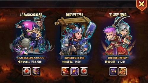 首先, 组队BOSS是玩家最先接触的日常玩法,这个也是武将成长所需资源——兵符的主要产出玩法,下图左面第一个就是组队BOSS了。