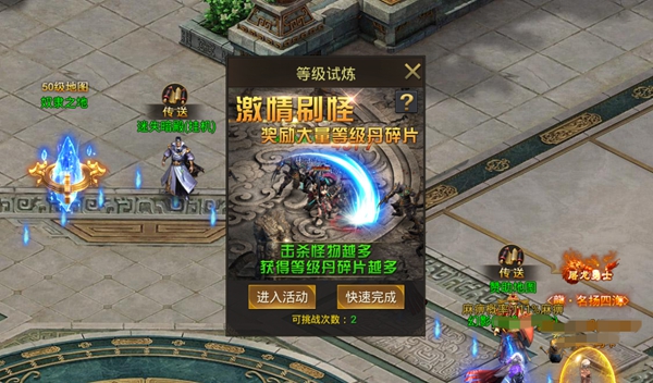 当然,随着大家等级的提升,所需等级丹的品质也在提升,由低到高分别为普通、高级、顶级、主宰、霸者。还有种特殊的万能等级丹,是无论等级多少都可以直接升一级的~获得它们,除了去对应的地图打BOSS之外,还有个等级试炼是可以刷到大量经验丹碎片的,然后再使用合成功能就可以轻松得到更高级的经验丹了。
